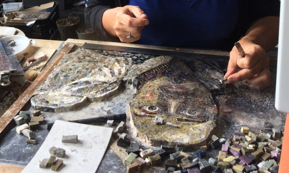 Elle partage son temps entre son travail personnel et la transmission de la technique de la mosaïque dans le cadre d’ateliers scolaires et de stages.
