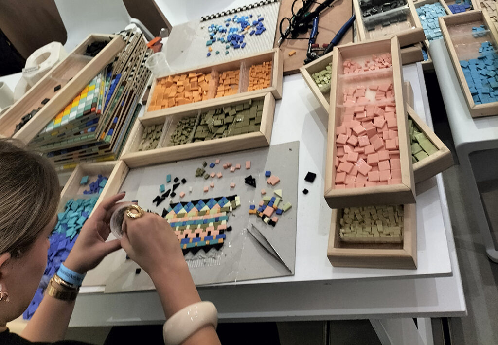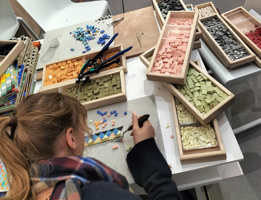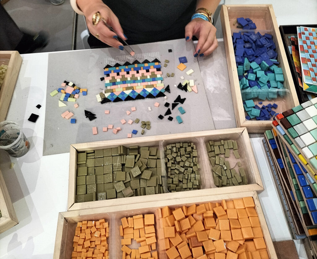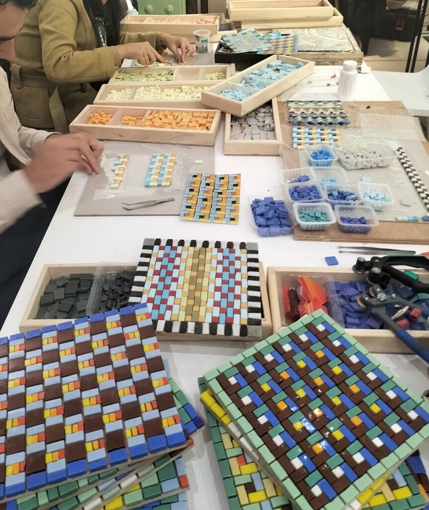 - Présentation des matériaux utilisés pour ses projets, les plaques manufacturées par les maîtres verriers vénitiens, les verres recyclés, ainsi que les smalti dorés à l’or fin. Elle vous expliquera les étapes de fabrication de ces matières très précieuses, ainsi que leur utilisation